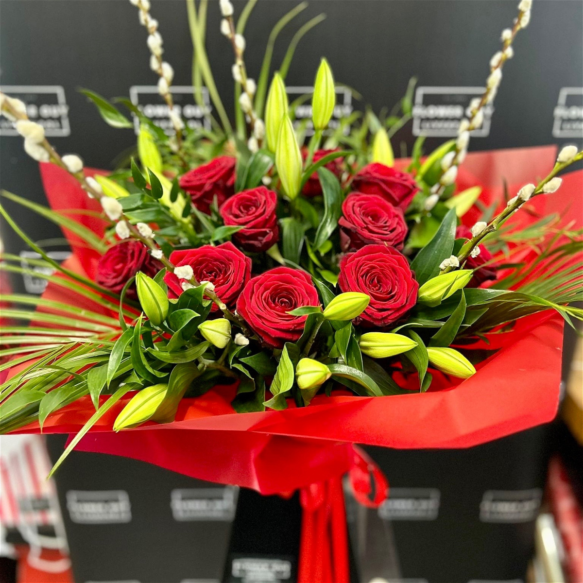 A gorgeous selection of roses, lillie’s and foliage. This bouquet features a double layered wrap, water vase and box/gift bag to match the colours chosen.