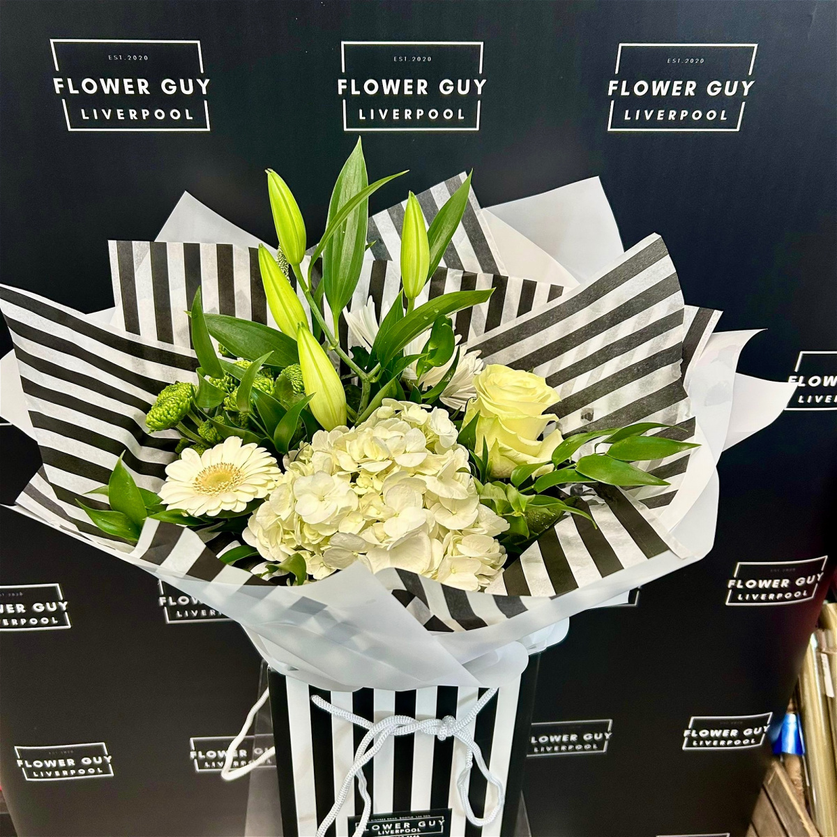 A popular style of bouquet featuring a selection of fresh cut seasonal flowers and foliage. This bouquet features a double layered wrap, water vase and box/gift bag to match the colours chosen.